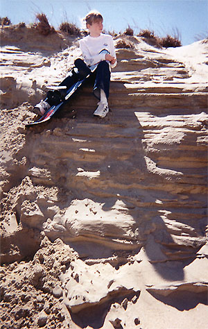 13 year old Shelbi Sanderson sitting on a ledge of layered sand deposits at Jockeys Ridge. The dunes here are